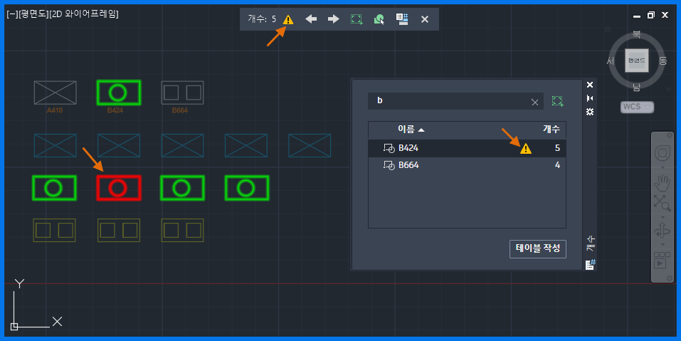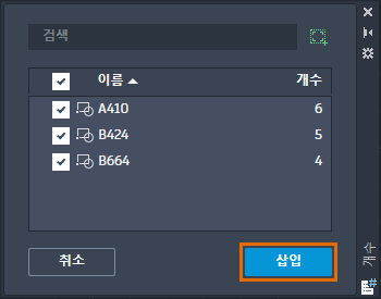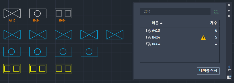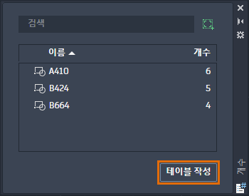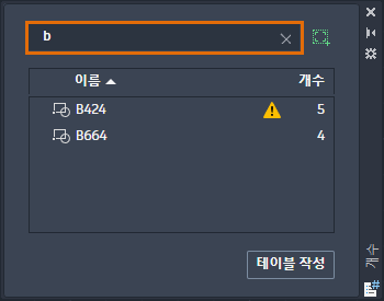 개수 팔레트에는 입력한 문자로 시작하는 블록 이름이 표시됩니다. 이 기능은 이름을 기준으로 블록과 해당 개수를 신속하게 찾아야 하는 경우에 유용합니다.