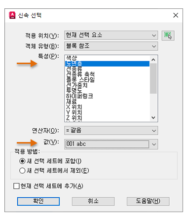 현재 도면층 001 abc에 있는 모든 블록이 선택됩니다. 아래와 같이 적용 대상 필드가 자동으로 현재 선택 요소로 전환된 것을 볼 수 있습니다.