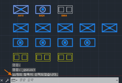 도면층 001 abc에 있는 모든 A410 블록만 선택됩니다. 선택 세트를 사용하여 QSELECT 명령을 반복해 선택 범위를 계속 좁힐 수 있습니다.