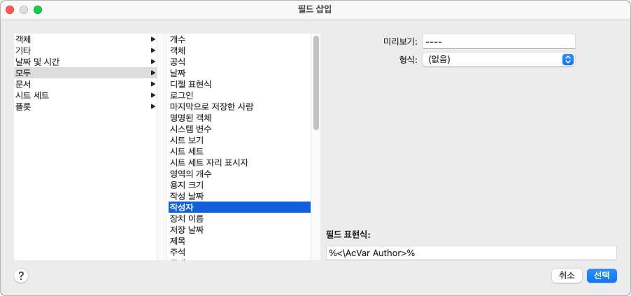 필드 이름에서 수식을 선택하면, 문자나 테이블 셀에 삽입할 수식을 작성하기 위한 공간이 제공됩니다.