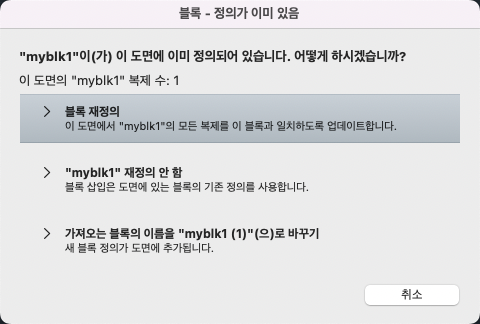현재 도면에서 블록 정의를 재정의하면 도면에서 이전에 삽입한 블록과 이후에 삽입할 블록이 둘 다 영향을 받습니다.