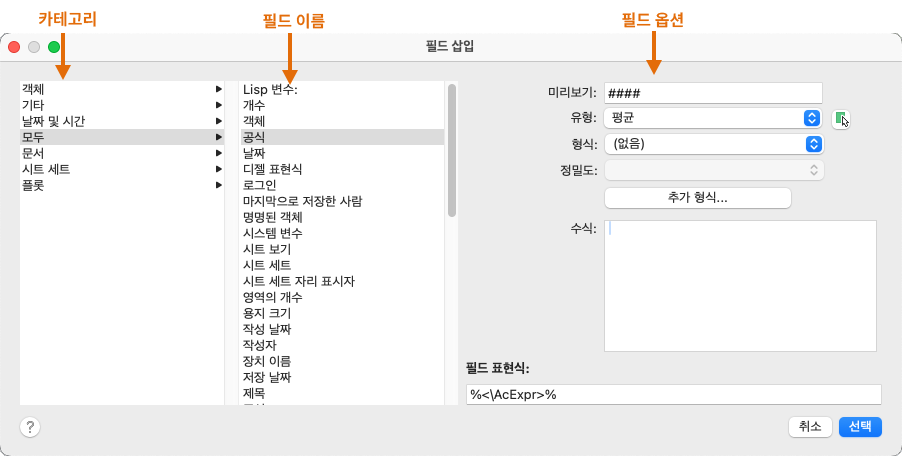 필드 삽입 대화상자에서 범주 및 필드 이름을 선택합니다.