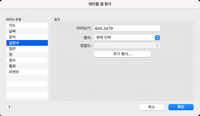 각도, 십진수, 점 및 정수 데이터 형식의 경우에만, 테이블 셀에 추가 형식 옵션을 설정하는 추가 형식 대화상자를 엽니다.