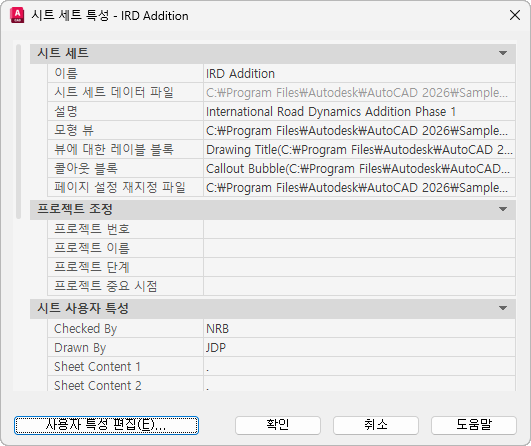 시트 세트에서 사용되는 도면이 들어 있는 폴더의 경로 및 이름을 표시합니다.