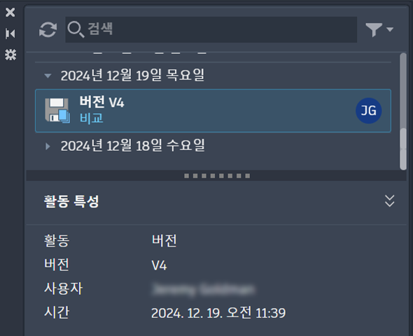 Autodesk Docs, Google Drive, OneDrive, Box 또는 Dropbox와 같은 지원되는 클라우드 저장소 공급자와 함께 활동 정보를 사용하면 저장할 때마다 각 도면의 새 버전이 기록됩니다. 각 버전 타일에서 비교를 클릭하여 이전 버전과 현재 버전을 쉽게 비교할 수 있습니다.