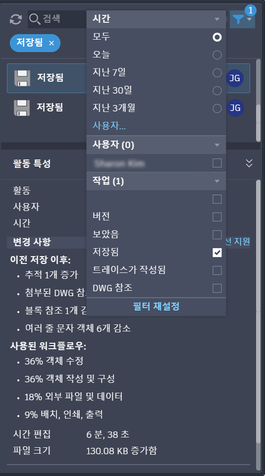활동 필터에서 저장됨을 선택하여 버전 활동을 분리할 수 있습니다. 추가로 필터링하려면 시간 및 사용자 필터를 사용합니다.