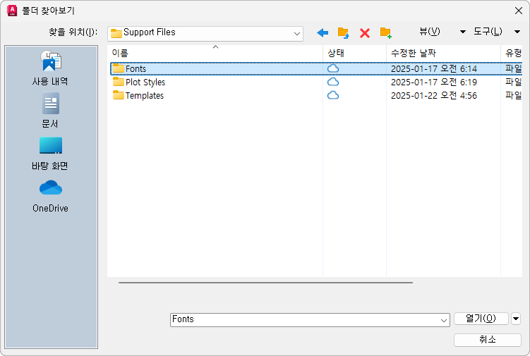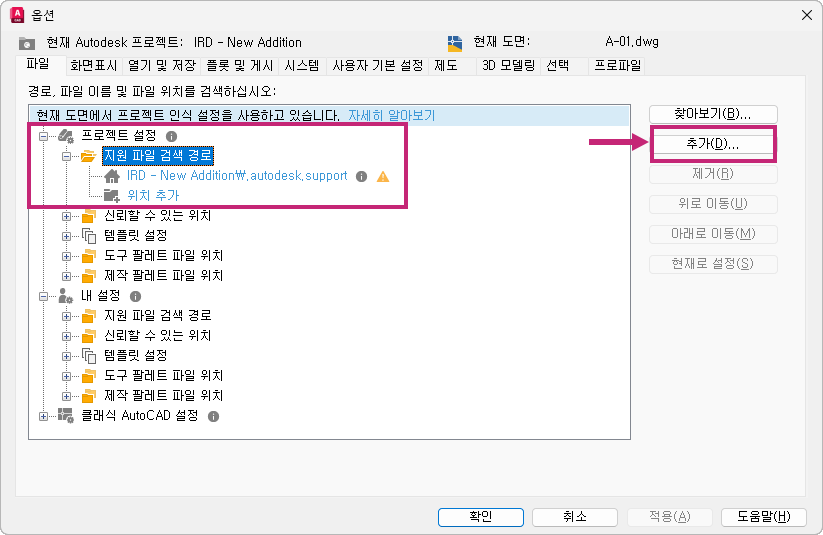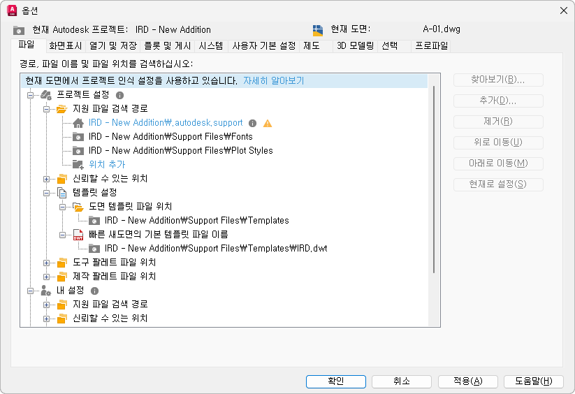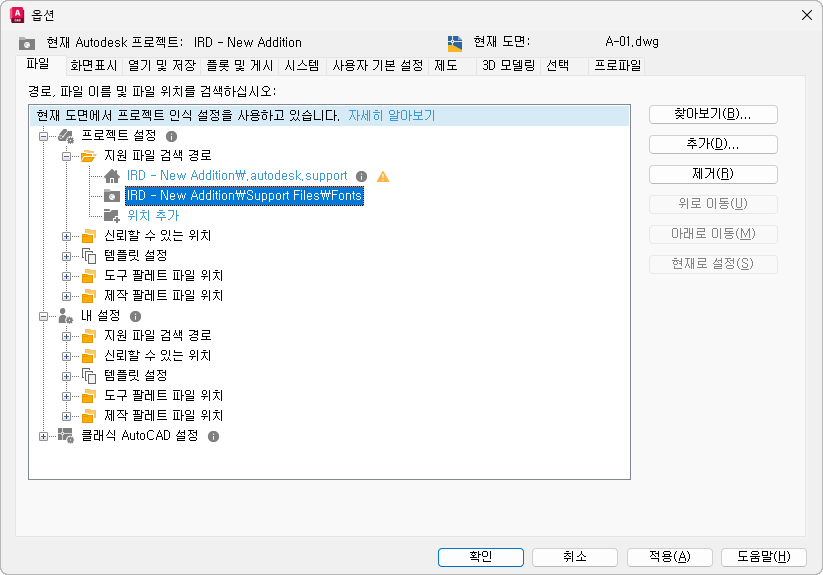 - 필요에 따라, 내 설정 및 클래식 AutoCAD 설정 노드에서 경로 설정을 수정합니다.