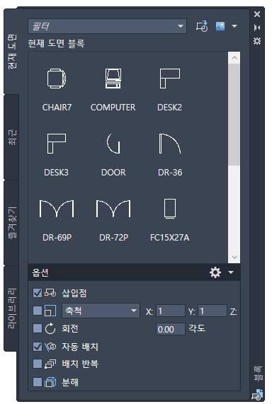 폴더의 도면 - 도면 파일을 파일 폴더에서 블록으로 현재 도면에 끌어 놓을 수 있습니다. |