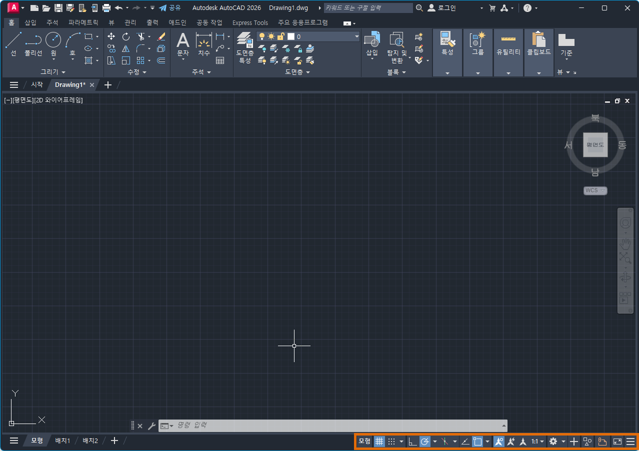 상태막대에는 도면 환경에 영향을 주는 도구, 도면 도구 및 커서 위치가 표시됩니다.