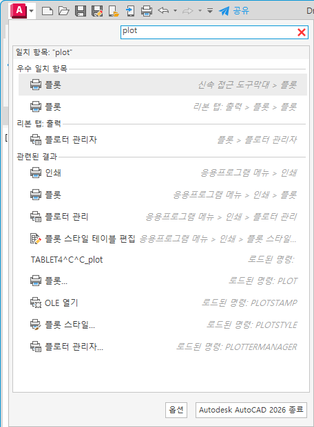 응용프로그램 메뉴의 맨 위에 명령 검색 필드가 표시되어 있습니다. 검색 결과에는 메뉴 명령, 기본적인 툴팁, 명령 프롬프트 문자열 등이 포함될 수 있습니다. 원하는 언어로 검색 용어를 입력할 수 있습니다. 결과는 현재 작업공간에 적용됩니다.
