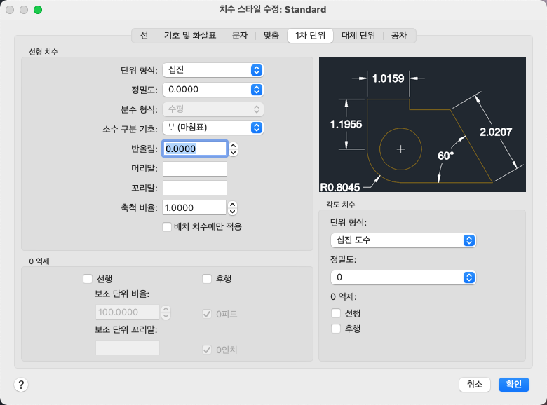 1차 치수 단위의 형식과 정밀도를 설정하고 치수 문자의 머리말과 꼬리말을 설정합니다.