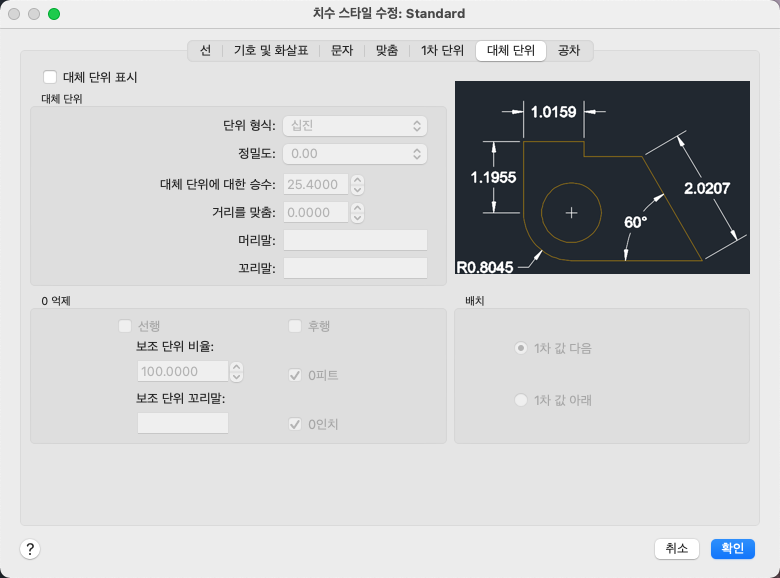 치수 문자에서 1차 단위 뒤에 대체 단위를 배치합니다.