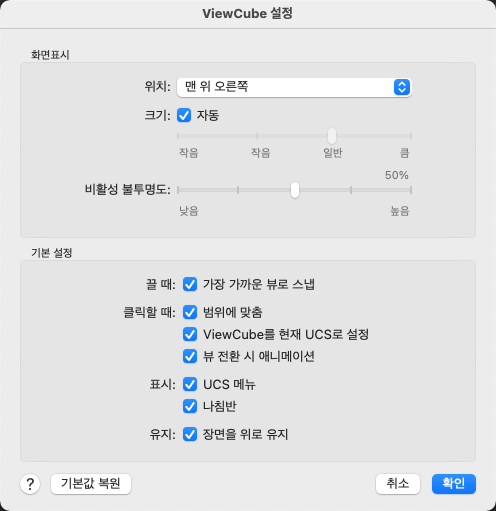 ViewCube 도구의 기본 설정을 적용합니다.