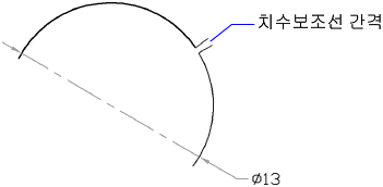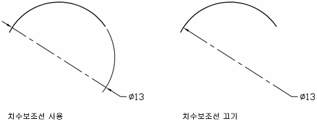 DIMSE1 시스템 변수는 호 끝을 넘어선 지점에 배치할 경우 반지름 또는 지름 치수가 치수보조선으로 그려지는지 여부를 조정합니다. 호 치수보조선의 표시를 억제하면 호와 호 치수보조선 사이에 간격이 생깁니다. 그려지는 간격의 크기는 DIMEXO 시스템 변수로 조정합니다.
