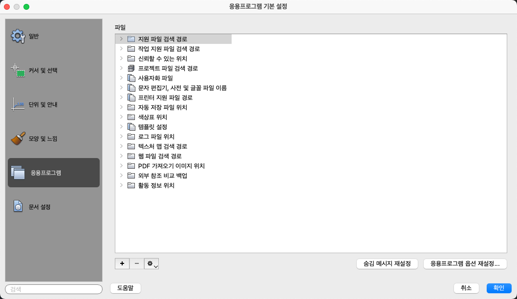프로그램에서 지원, 드라이버, 메뉴 및 다른 파일을 검색하는 폴더를 나열합니다. 또한 철자 검사에 사용할 사전 종류와 같은 선택적이며 사용자 지정된 설정을 나열합니다.