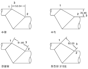 네 그림 모두에서 치수보조선 원점은 각각 1과 2로 표시되어 있습니다. 치수 선 위치는 3으로 지정됩니다.