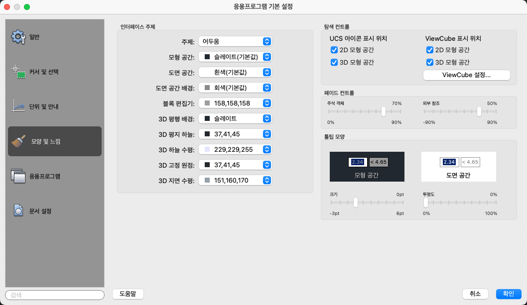 상태막대, 팔레트, 도면 윈도우 등의 요소에 적용할 주제를 조정합니다. 어두운 주제 또는 밝은 주제를 선택할 수 있습니다.