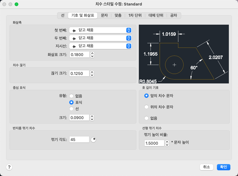 화살촉, 중심 표식, 호 길이 기호 및 꺾어진 반지름 치수의 형식과 배치를 설정합니다.