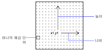 다음 그림은 간지 문자와 같은 확장 큰 글꼴을 디자인하는 데 사용할 수 있는 16 x 16 점 매트릭스의 예제입니다. 이 예제에서 각 점 사이의 거리는 한 단위입니다. 콜아웃은 제곱 단위를 가리킵니다.