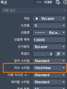 객체를 선택하지 않은 경우 현재 치수 스타일 이름(이 경우 Hitchhiker)이 특성 검사기의 드롭다운 리스트에 표시됩니다.