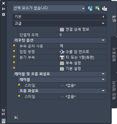 특성 팔레트의 설계 탭에서 파이프 객체를 추가하는 데 사용할 수 있는 특성입니다.