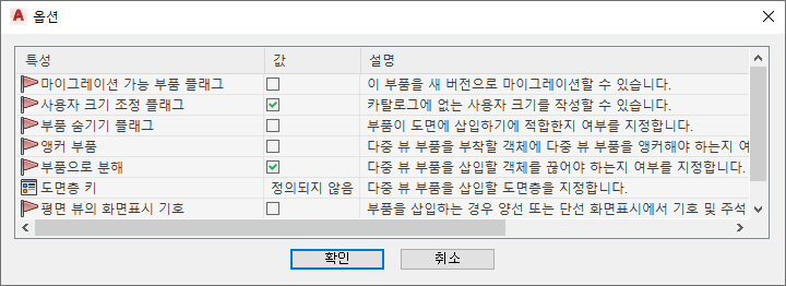 파라메트릭 다중 뷰 부품에 대한 옵션 대화상자