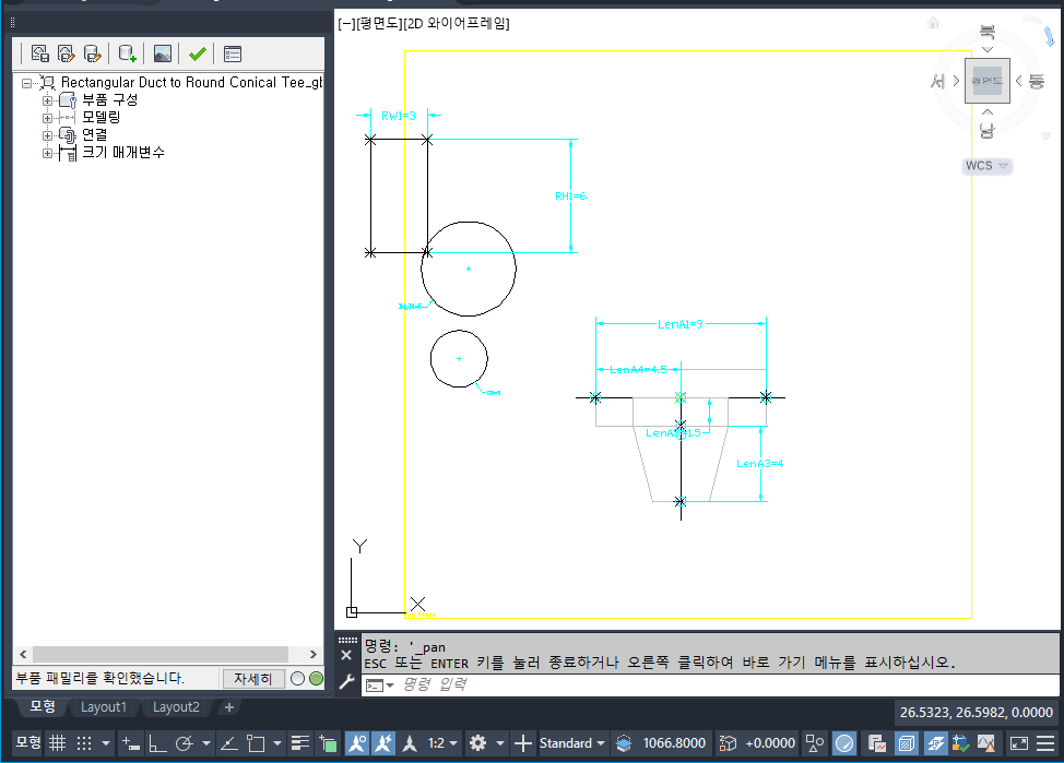 - 모델링 영역은 화면의 오른쪽에 표시되며 부품 모형을 전체 뷰 조정할 수 있도록 설계되었습니다. 표준 AutoCAD 뷰 명령을 사용하여 부품 모형을 보는 방향을 변경할 수 있습니다.
