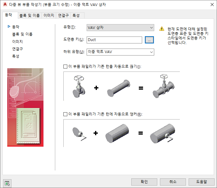 컨텐츠 작성기 대화상자는 AutoCAD MEP 2026 toolset의 사용자 부품을 작성할 수 있는 여러 가지 작업별 옵션을 제공합니다. 파라메트릭 부품과 블록 기반 부품을 모두 작성하거나 수정할 수 있습니다.