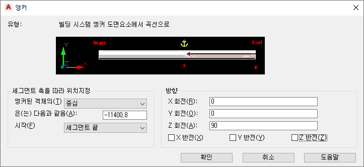 앵커는 AutoCAD MEP 2026 toolset 객체를 다른 객체 또는 배치 곡선이나 그리드에 연결합니다. 파이프 도메인에서 이 워크시트는 앵커를 사용하는 부속(예: 테이크오프)에 적용되고, 스키매틱 도메인에서는 기호에 적용됩니다. X, Y 및 Z 삽입점을 보고 현재 좌표계 및 앵커의 회전 각도를 기준으로 수정할 수 있습니다. 치수가 기입된 위치를 지정하거나 X, Y 또는 Z축 주위로 앵커를 반전하여 세그먼트 축을 따라 앵커된 객체를 재배치할 수 있습니다. 앵커 탭은 객체가 앵커 도구에 앵커된 후에만 사용할 수 있습니다.