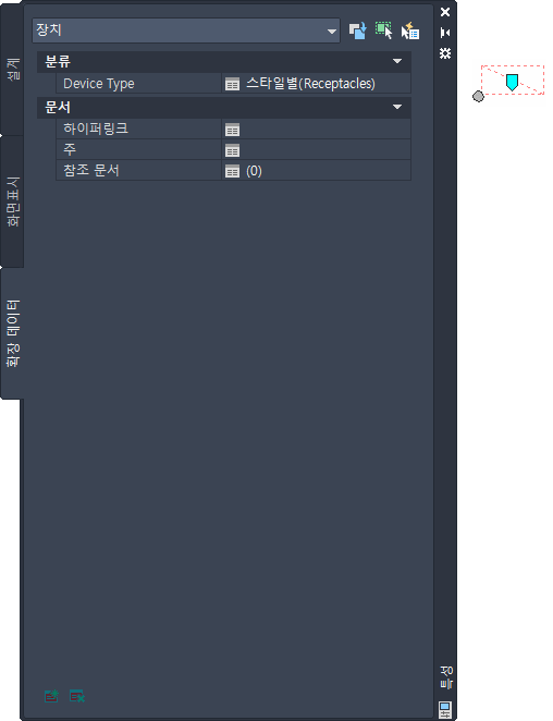 도면에 있는 장치가 장치 스타일의 인스턴스이기 때문에 장치에는 장치 스타일의 각 분류 정의에 대한 특성이 있습니다. 특성 팔레트의 확장 데이터 탭에서는 도면에 있는 하나 이상의 장치에 대한 분류를 보거나 재지정할 수 있습니다.