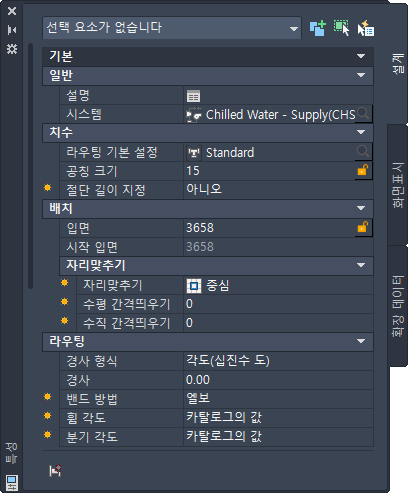 기본적으로 파이프 특성 팔레트에는 기본 특성이 표시됩니다.