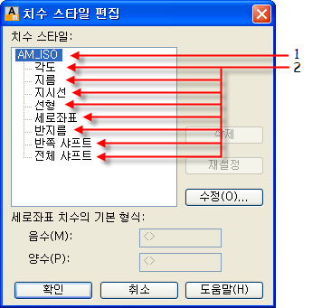 제도 표준과 연관된 치수 스타일은 해당 표준의 치수에 대한 기본 설정을 정의하는 기준 치수 스타일(그림의 1)과 다른 유형의 치수에 대한 스타일을 명시적으로 정의하는 하위 스타일(그림의 2)로 구성됩니다. 대부분의 경우 하위 스타일은 기준 스타일과 같습니다. 치수 유형에 고유한 특징을 지정해야 할 경우 이 치수 스타일의 기본 설정에는 기준 치수 스타일과 다른 설정이 두 개 이상 있을 수 있습니다.