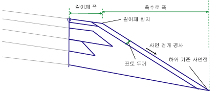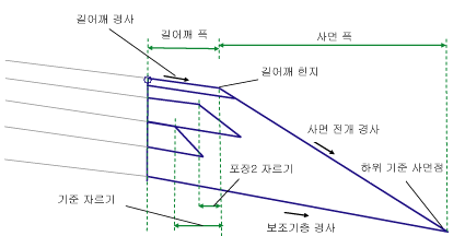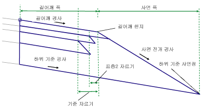 | 보조기층 사면 전개 유형 | 사면 전개 링크를 가변 폭을 갖는 고정 경사로 유지할지 아니면 가변 경사를 갖는 고정 폭으로 유지할지 선택합니다. | 선택 리스트: a) 경사 유지, 폭 조정, b) 폭 유지, 경사 조정 | 경사 유지, 폭 조정 |