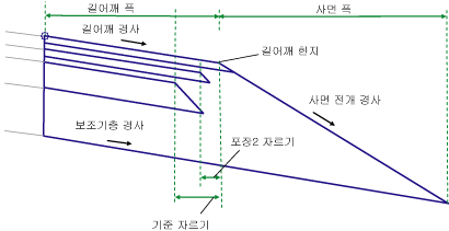 부착점에서 외향으로 지정된 길어깨 폭 및 기본 길어깨 경사에 해당하는 길어깨의 정지 계획선이 삽입됩니다. 보조기층 링크는 정지 계획선 아래의 보조기층 깊이에서 시작되는 부착점에서 삽입됩니다.