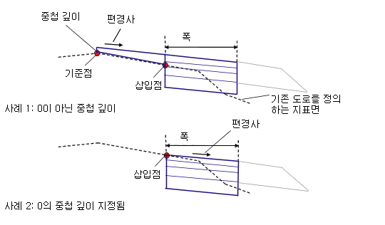 중첩 깊이를 0이 아닌 값으로 지정하면 기준점에서 중첩 깊이가 적용됩니다. 중첩 도면층의 맨 위가 편경사의 삽입점 간격띄우기로 확장되고 기준점과 삽입점 간의 기존 지표면 위에 링크를 겹치고 양쪽 끝에 수직 링크를 추가하여 중첩 쉐이프를 닫습니다. 확장 차선은 지정된 폭에 대한 편경사로 중첩 지표면의 모서리에서 외향으로 확장됩니다.