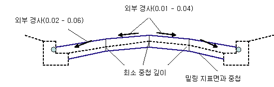중첩 링크가 너무 급격하거나 중심선에서 최대 횡단 경사 변경부가 초과되거나 최소 크라운 편각이 확보되지 않으면 링크 일부 또는 전체가 최대 경사까지 평평해집니다. 1/4 점 및 중심전에서 최소 중첩 깊이를 유지하도록 밀링 지표면이 삽입됩니다.