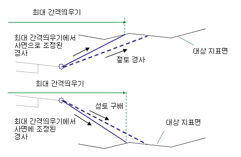 필요한 경우, 사면 전개점이 기준선에서 최대 간격띄우기(+/-) 내에 있도록 경사를 조정합니다.