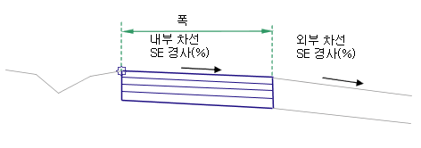 내부 차선 편경사는 기준선 선형의 편경사 지정에서 가져옵니다. 부착점에서 시작하는 정지 계획선 지표면과 평행 노상이 지정된 폭, 깊이 및 편경사를 사용하여 삽입됩니다. 수직 링크가 차선 양쪽 끝에서 쉐이프를 닫습니다.
