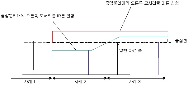 중앙분리대 모서리를 정의하는 선형은 없거나(사례 1), 도로 중심선 밖에 있거나(사례 2) 중심선 안에 있을 수 있습니다(사례 3). 이 횡단구성요소를 사용하려면 중앙분리대의 왼쪽 및 오른쪽 모서리를 정의하는 별도의 선형이 있어야 합니다. 각 개별 중앙분리대에 대해 별도의 코리더 모델 영역을 정의해야 할 수도 있습니다.