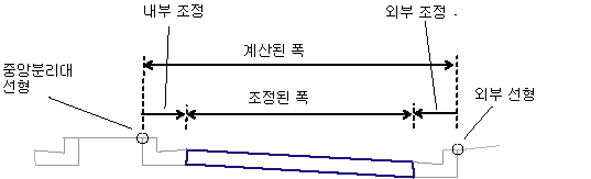 내부 및 외부 조정: 내부 조정 및 외부 조정 매개변수는 중앙분리대 모서리 또는 차선 모서리에 사용되는 선형이 실제 주행로 모서리에서 고정된 간격띄우기에 있는 경우 제공됩니다. 예를 들어, 중앙분리대 모서리에 사용되는 선형은 포장 모서리가 아닌 연석 뒤에 있을 수 있습니다. 이 경우, 내부 조정 매개변수는 연석의 폭으로 설정되어야 합니다.