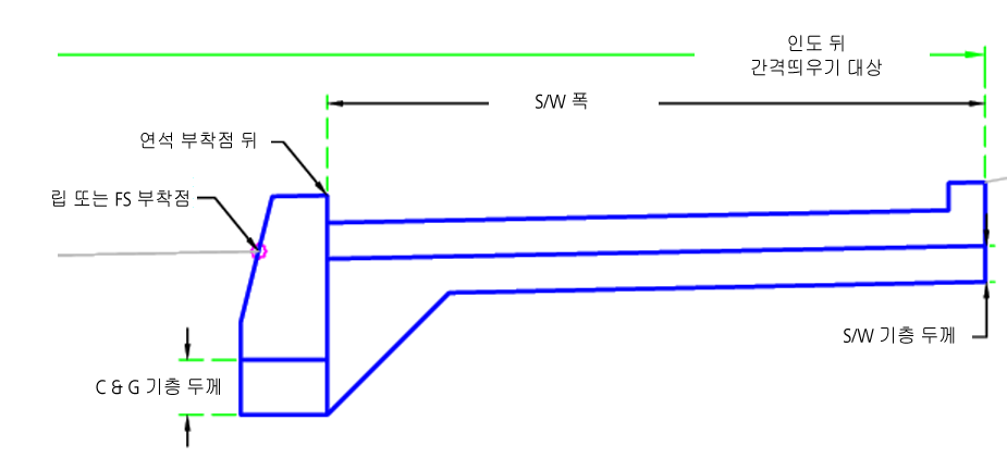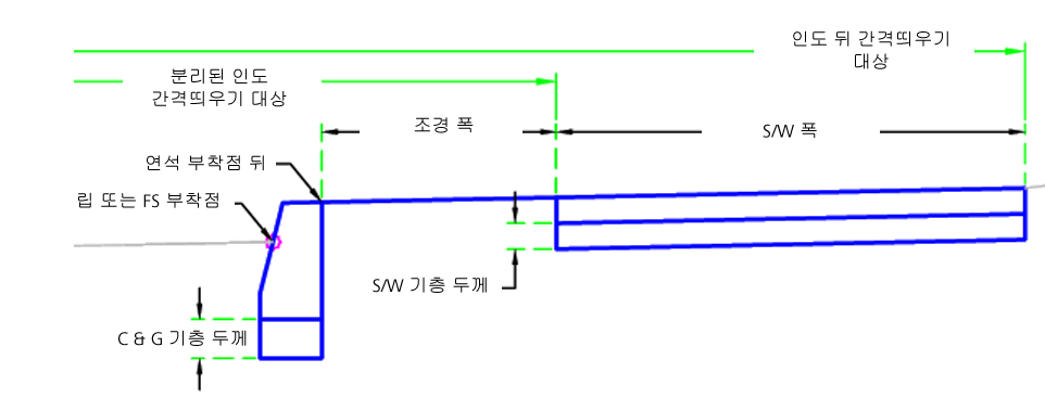 | 인도 뒤 간격띄우기 | 인도의 고정 폭을 재지정하고 외부 인도 모서리를 간격띄우기 선형에 연결하는 데 사용할 수 있습니다. 폭을 지정하기 위한 대상으로 선형, 폴리선, 형상선 또는 측량 수치 객체 유형을 사용할 수 있습니다. | 선택 사항 |