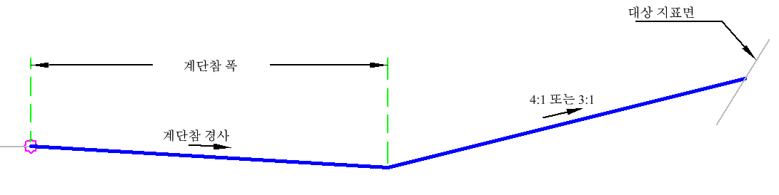 계단참이 입력 매개변수를 사용하여 그려집니다. 사면 전개까지 높이가 계산됩니다. 거리가 25ft(7.5m) 미만이면 4:1 사면 전개 경사가 사용됩니다. 높이가 35ft(10.5m) 미만이면 3:1 사면 전개 경사가 사용됩니다. 그 외 경우 2:1 사면 전개 경사가 사용됩니다.