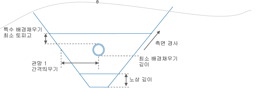 | 특수 되메우기 최소 토피고 | 가장 높은 외부 파이프 지름 위에 놓는 특수 되메우기 토피고의 최소량입니다. | 숫자, 양수 | 0.0 |