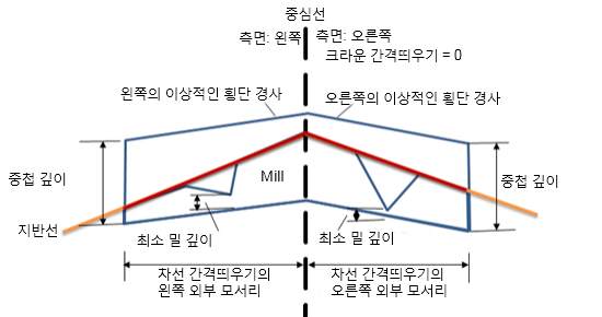 | 오른쪽 최소 밀링 깊이 | 밀링 도면층 맨 아래와 오른쪽 측면의 지반선 도면층 맨 아래 사이의 최소 밀링 깊이입니다. | 숫자, 양수 | 0.300m(0.300피트) |