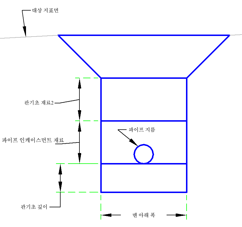 터파기 하단의 표고는 종단 경사선 표고에서 파이프 반지름을 빼고 관기초 깊이를 더해서 계산합니다. 수평 터파기 하단 링크는 해당 표고를 기준으로 부착점 간격띄우기만큼 대칭으로 배치됩니다. 파이프 인케이스먼트 재료 깊이는 파이프 주위 재료를 제공하는 데 사용됩니다. 파이프 인케이스먼트 재료 위는 재료2로 지정되어 있고 파이프 위의 재료를 제공합니다. 측면 경사가 위쪽으로 기존 지표면까지 확장됩니다. 수평 관기초 링크는 터파기 하단 위에 지정된 깊이로 배치됩니다.