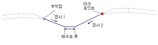 부착점 및 마크 포인트의 위치가 결정됩니다. 마크 포인트는 부착점의 왼쪽 또는 오른쪽에 있을 수 있습니다. 링크는 서로 교차할 때까지 부착점에서 경사 1의 안쪽으로 확장되고 마크 포인트에서 경사 2의 안쪽으로 확장됩니다. 배수로 폭을 지정하면 배수로 링크의 수평 맨 아래가 교차하는 측면 경사에 맞게 조정됩니다.