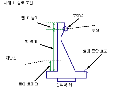| 토대 토피고 | 토대 맨 위에서 성토의 벽 뒷쪽 마감 경사선 또는 절토의 갈고리까지의 토피고 깊이입니다. | 숫자 |