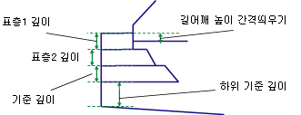 표층1, 표층2 및 기층 지표면 링크가 지정된 깊이로 정지 계획선에 평행하게 삽입됩니다. 도면층 확장 값이 0이 아니면 각 도면층은 지정된 거리에 대해 길어깨 힌지점을 초과하여 확장됩니다. 각 도면층은 상위 도면층과 같은 폭이거나 더 넓어야 합니다.