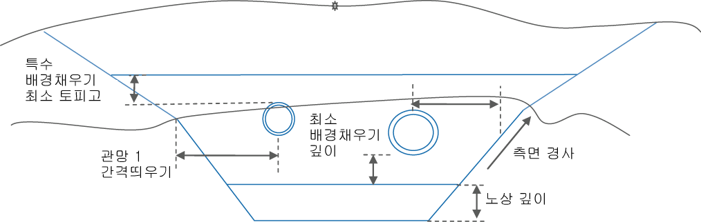 | 특수 되메우기 최소 토피고 | 가장 높은 파이프 위에 놓는 특수 되메우기 토피고의 최소량입니다. 파이프는 파이프의 맨 위 외부 지름에서부터 측정됩니다. | 숫자, 양수 | 0.0 |