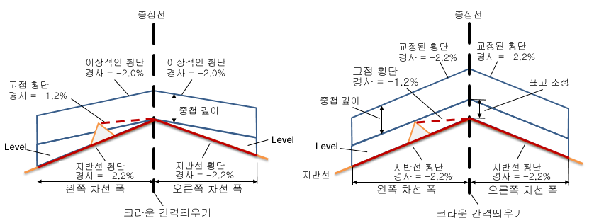 | 교정된 횡단 경사 | 교정된 횡단 경사가 -2.2%로 조정됩니다. |